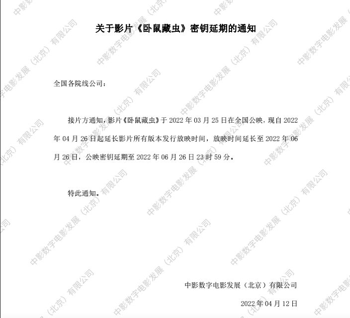关于影片《卧鼠藏虫》第三次密钥延期的通知