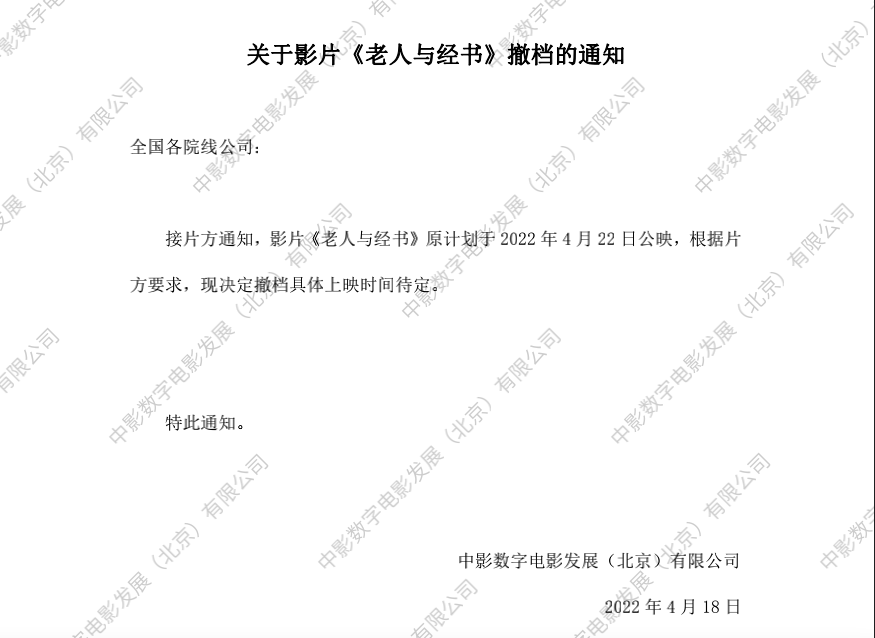 发行通知 » 《老人与经书》撤档的通知
