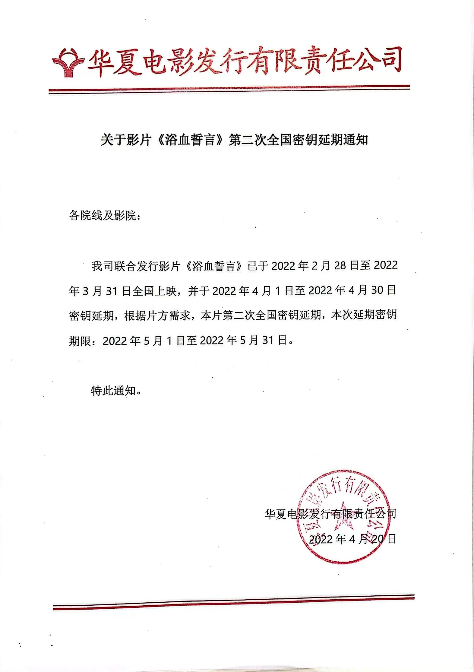 《浴血誓言》密钥延期及调整上映范围的通知