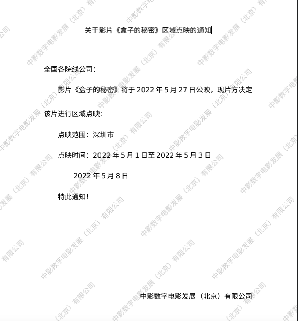 《盒子的秘密》区域点映的通知