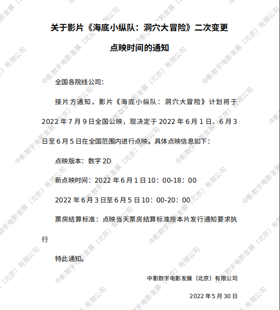 《海底小纵队:洞穴大冒险》调整票房分账比例的通知