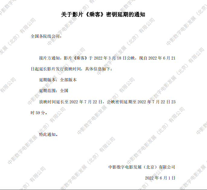 关于影片《乘客》第四次密钥延期的通知