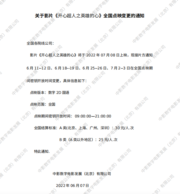 关于影片《开心超人之英雄的心》密钥延期及结算标准变更的通知