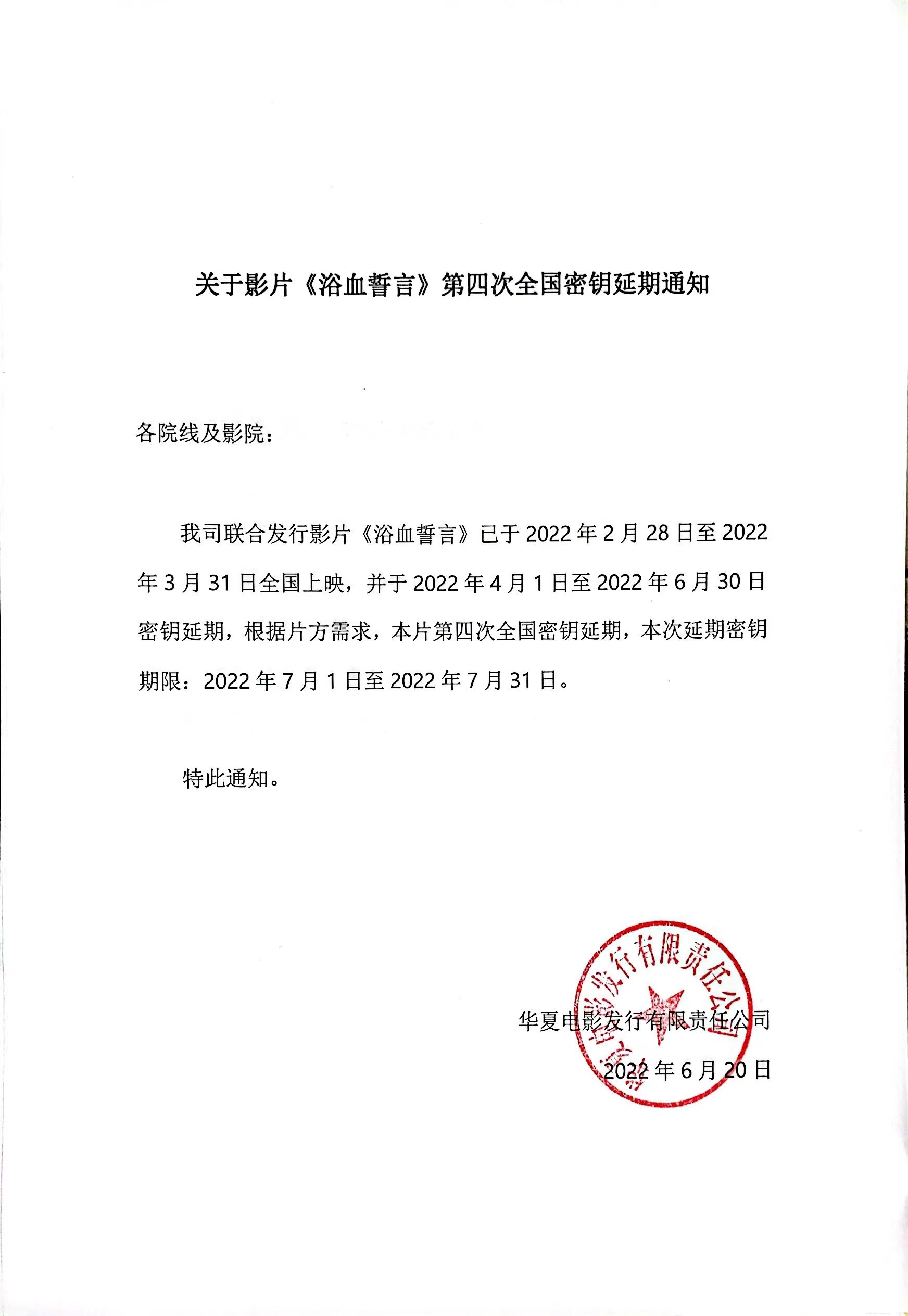 《浴血誓言》密钥延期及调整上映范围的通知
