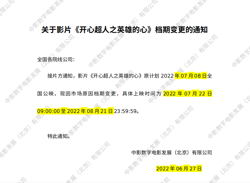 关于影片《开心超人之英雄的心》密钥延期及结算标准变更的通知