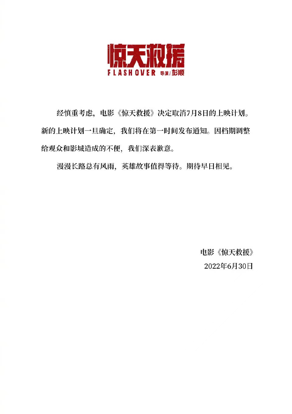 电影《惊天救援》发布公告,宣布决定取消7月8日的上映计划,新档期待定。该片由彭顺执导,杜江、王千源、佟丽娅、韩雪、俞灏明、韩东君、王戈等主演,是一部消防救援题材电影。