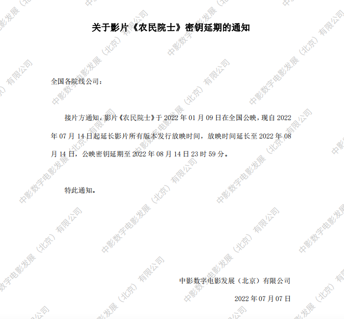 关于影片《农民院士》第六次密钥延期的通知
