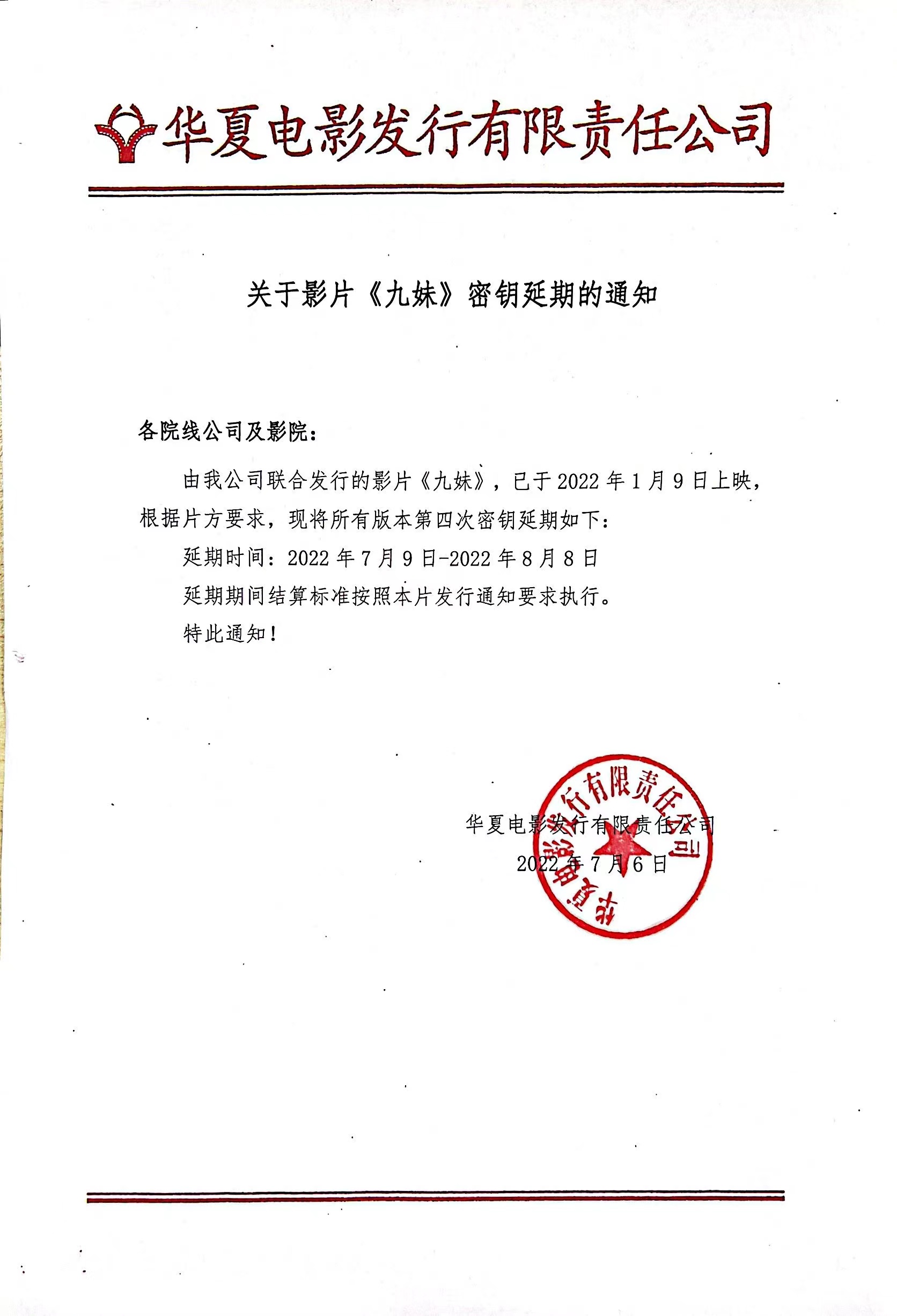 《九妹》密钥延期的通知