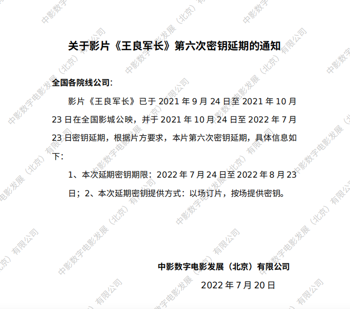 发行通知 » 《王良军长》第六次密钥延期的通知