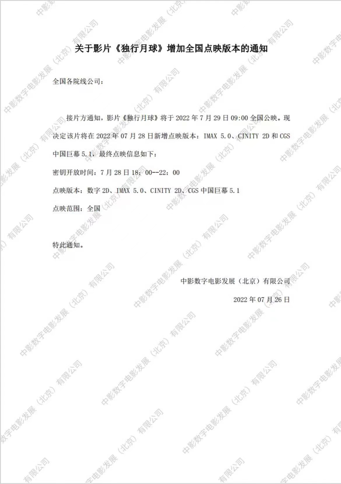 发行通知 » 关于影片《独行月球》增加全国点映版本的通知