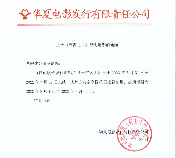 《云霄之上》密钥延期的通知