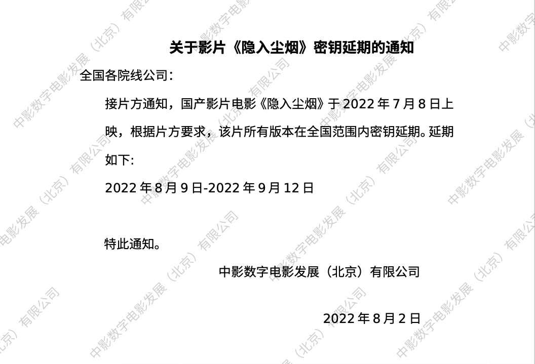 《隐入尘烟》密钥延期的通知