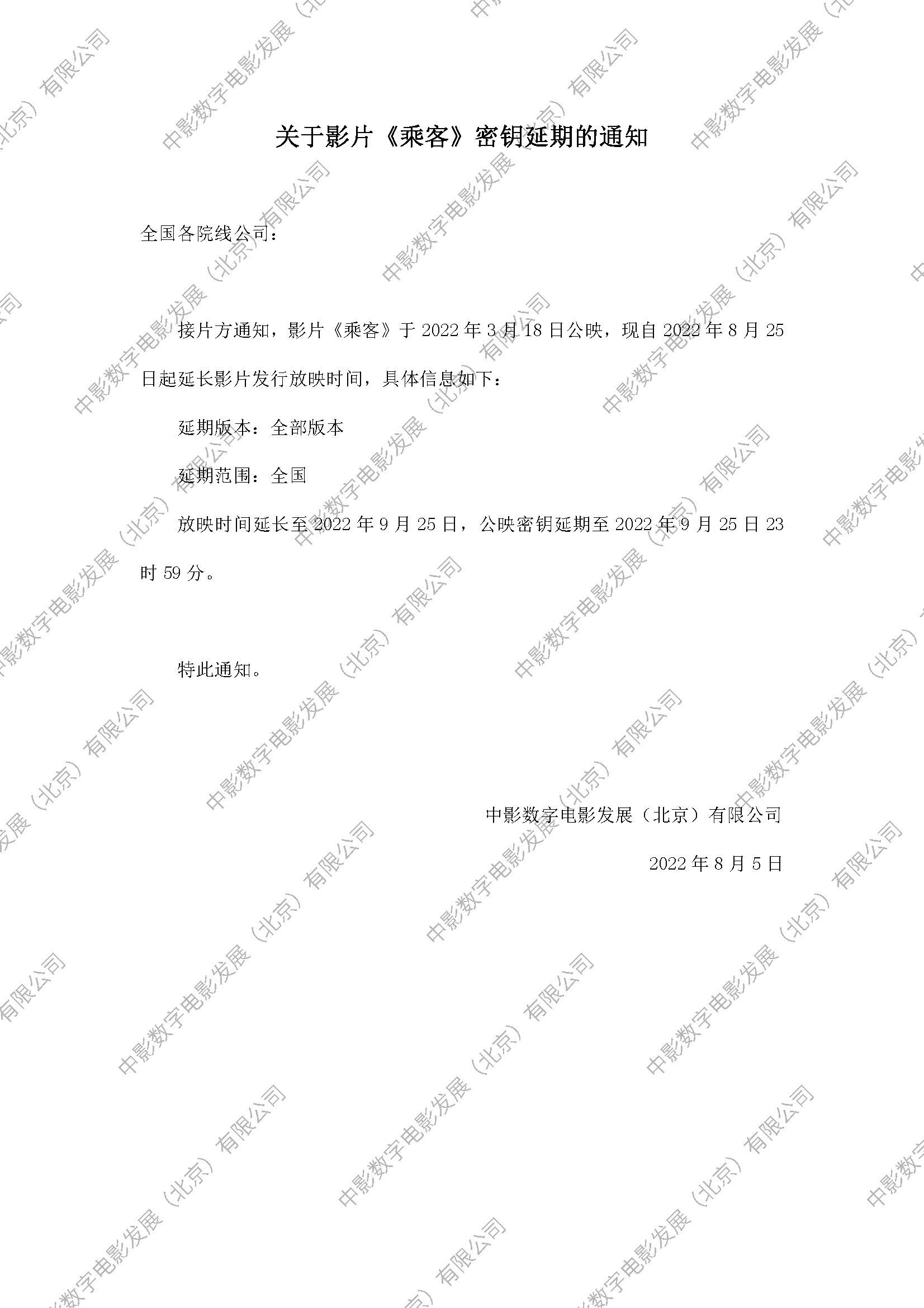 《乘客》密钥延期的通知