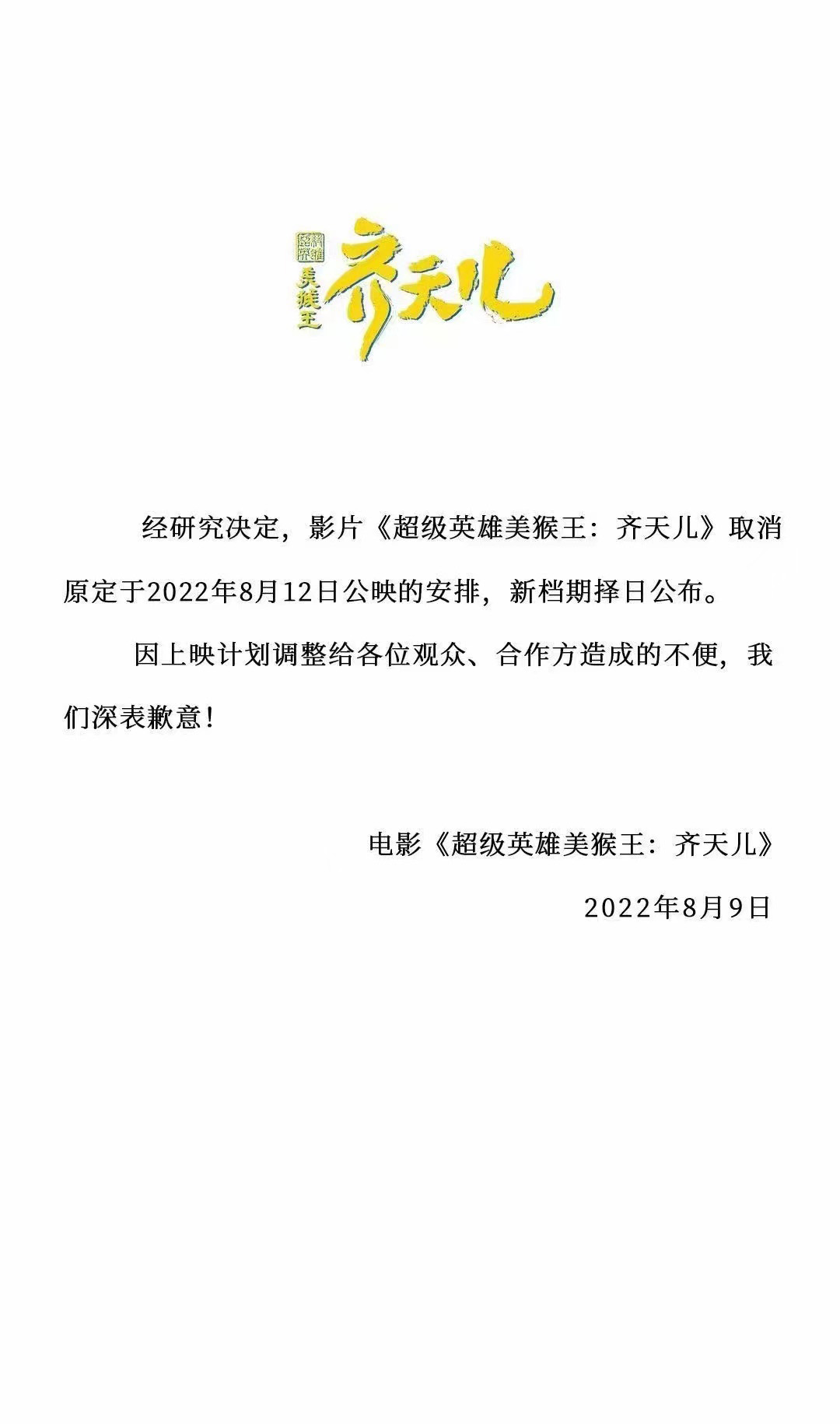 《超级英雄美猴王:齐天儿》档期变更的通知