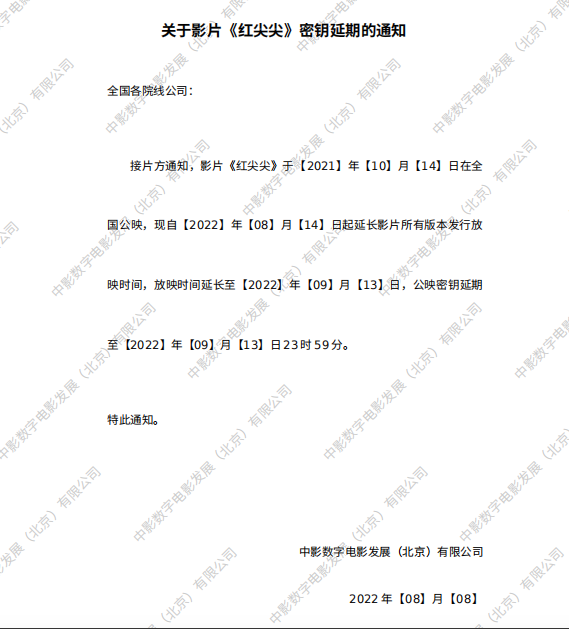 关于影片《红尖尖》第五次密钥延期的通知