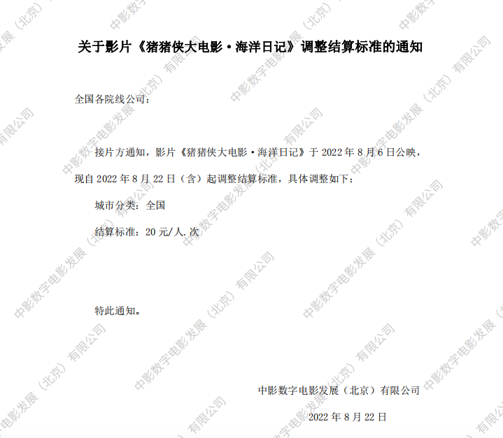 《猪猪侠大电影·海洋日记》结算标准变更通知