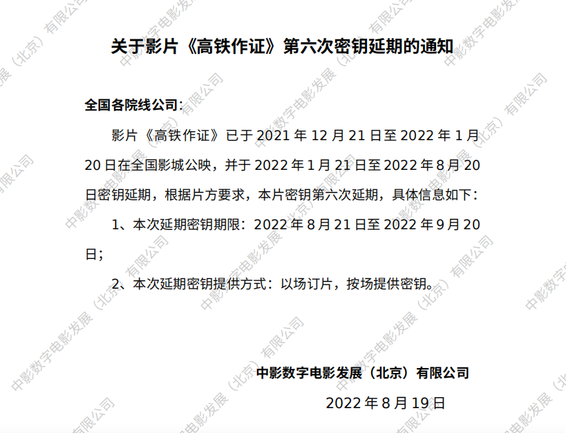 《高铁作证》第十一次密钥延期的通知