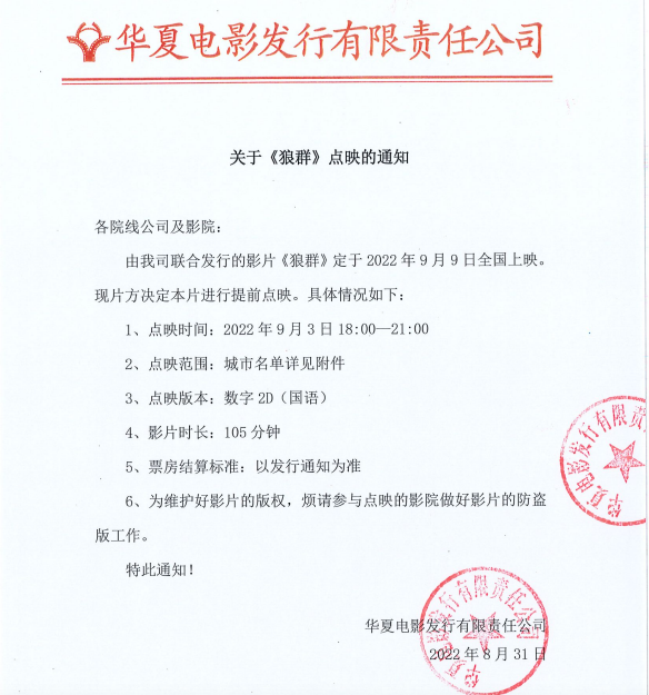 《狼群》点映的通知