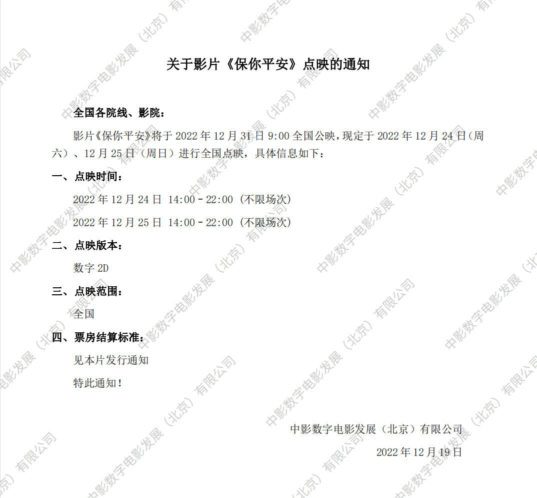 《保你平安》全国点映的通知