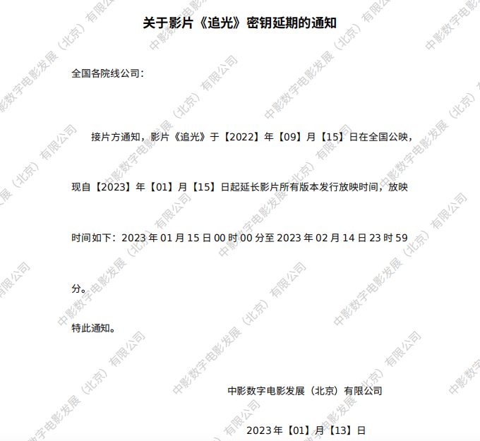 《追光》全国密钥延期的通知