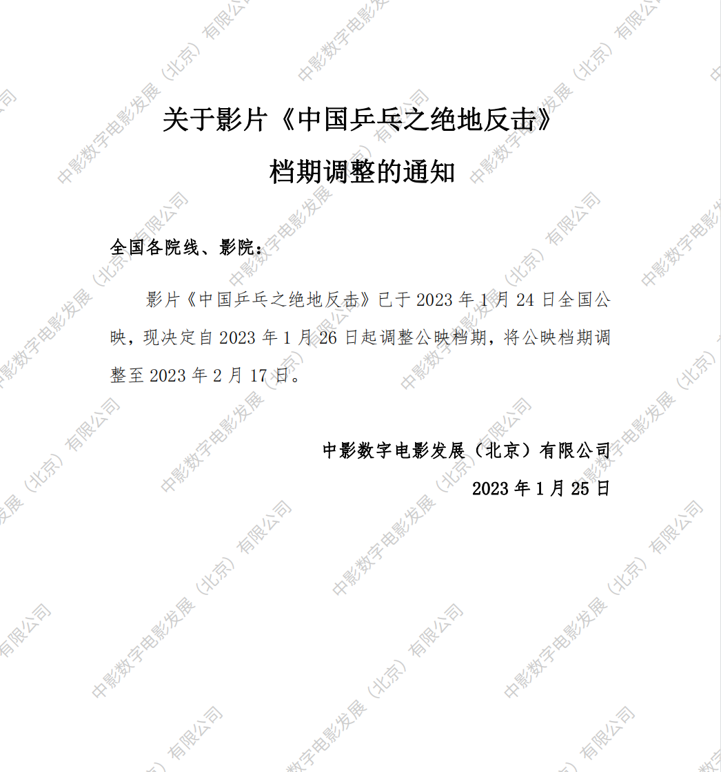 《中国乒乓之绝地反击》二次密钥延期及调整票房结算标准的通知