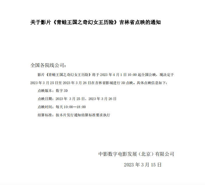 发行通知 » 《青蛙王国之奇幻女王历险》吉林省点映的通知