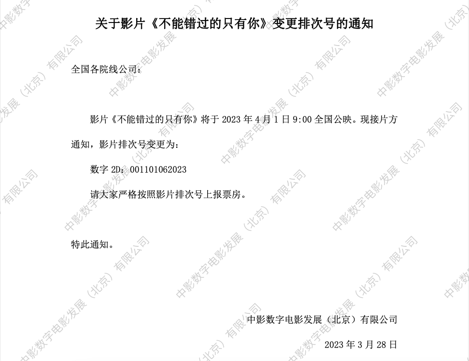《不能错过的只有你》全国点映的通知