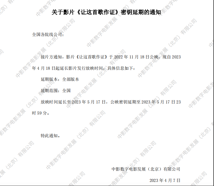 《让这首歌作证》第十四次密钥延期的通知