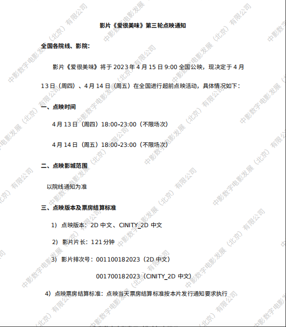 影片《爱很美味》第三轮点映通知
