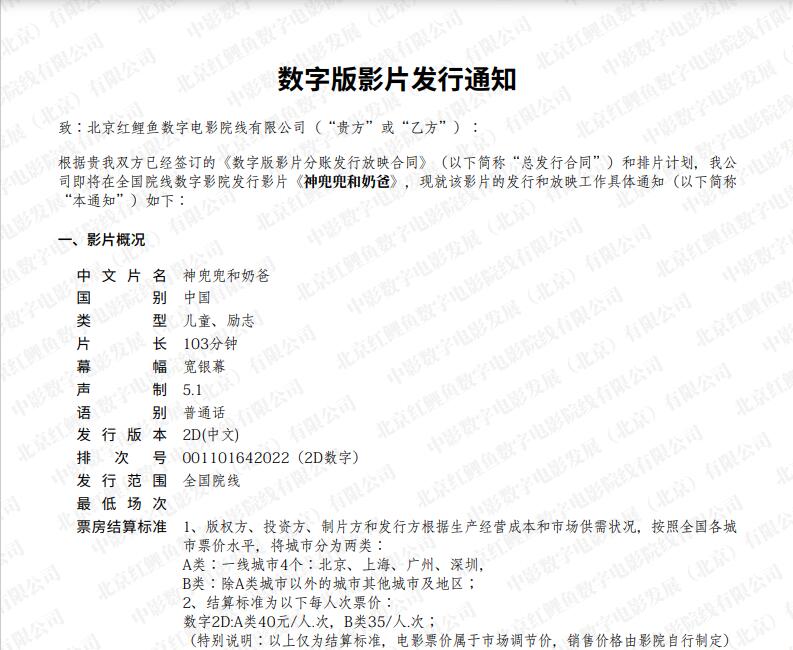《神兜兜和奶爸》调整票房结算标准的通知