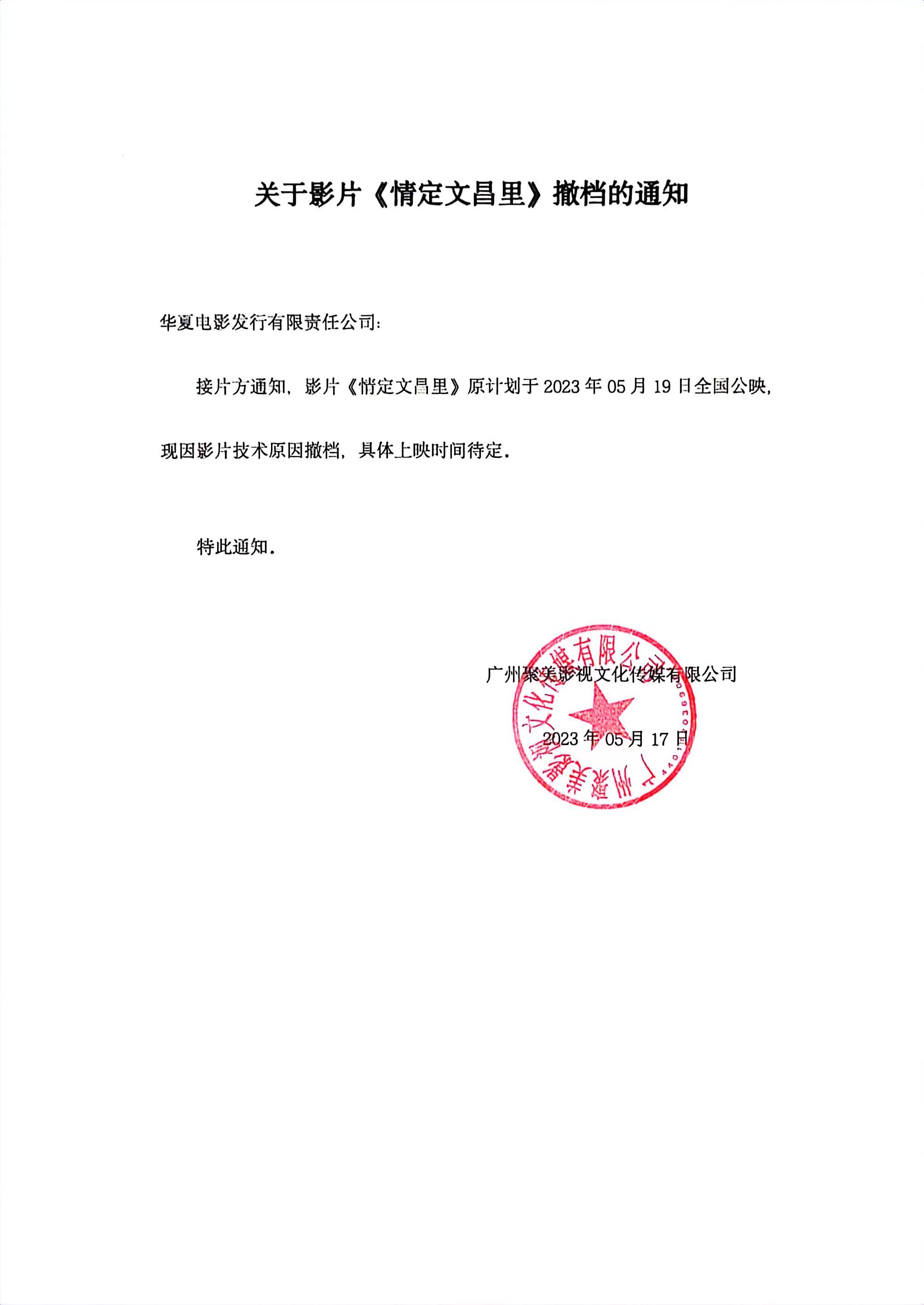 发行通知 » 《情定文昌里》申请撤档的函