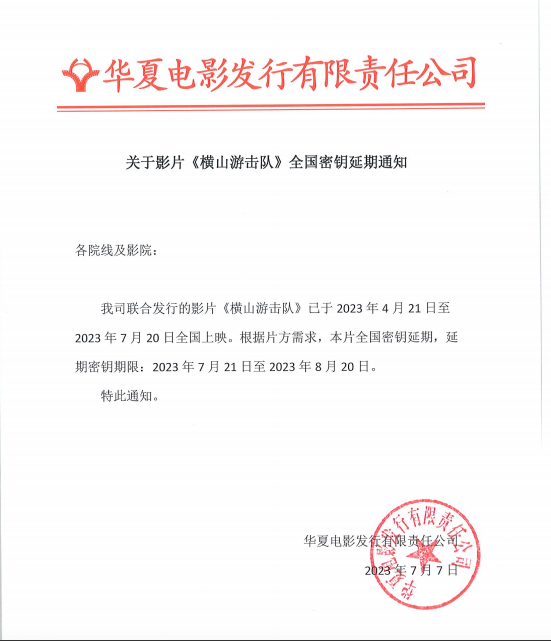 关于影片《横山游击队》全国密钥延期通知
