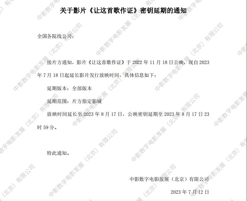 《让这首歌作证》第十四次密钥延期的通知