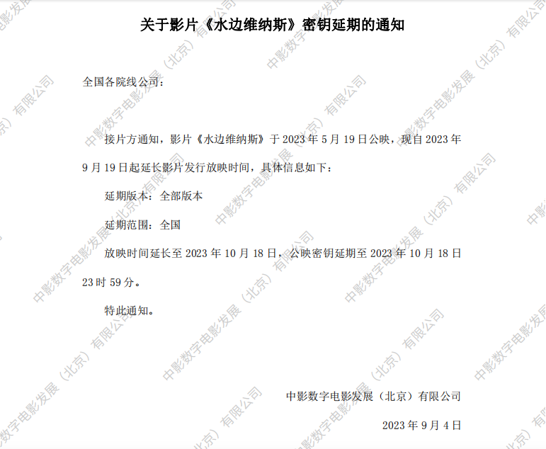 关于影片《水边维纳斯》第九次密钥延期的通知