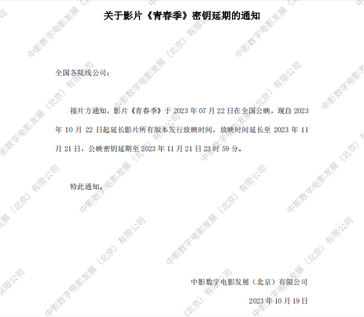 关于影片《青春季》六次密钥延期的通知
