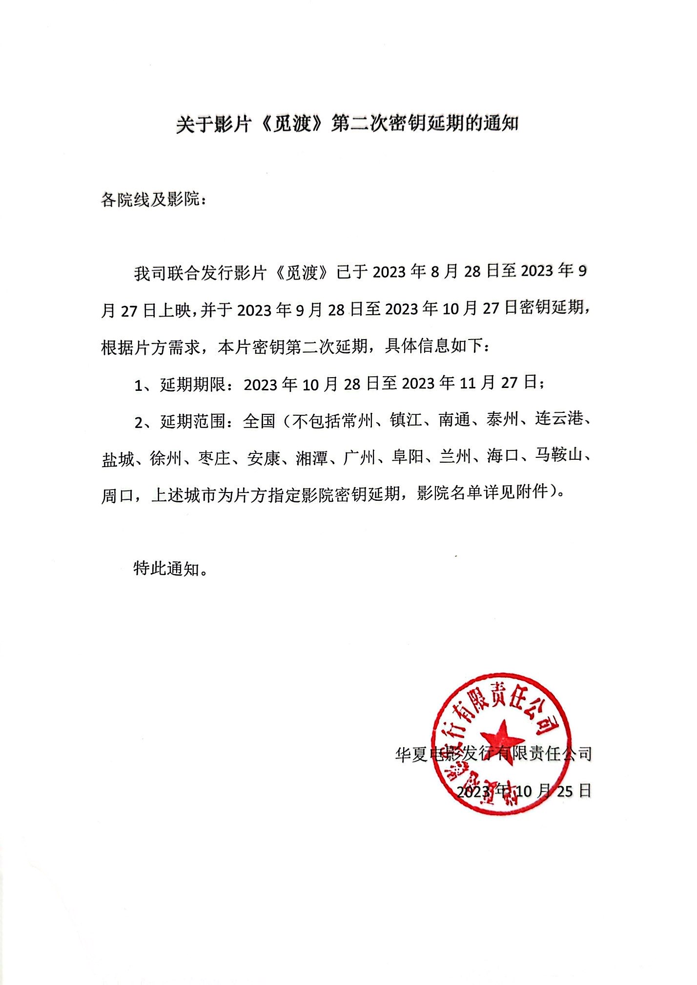 《觅渡》第二次变更上映范围的通知