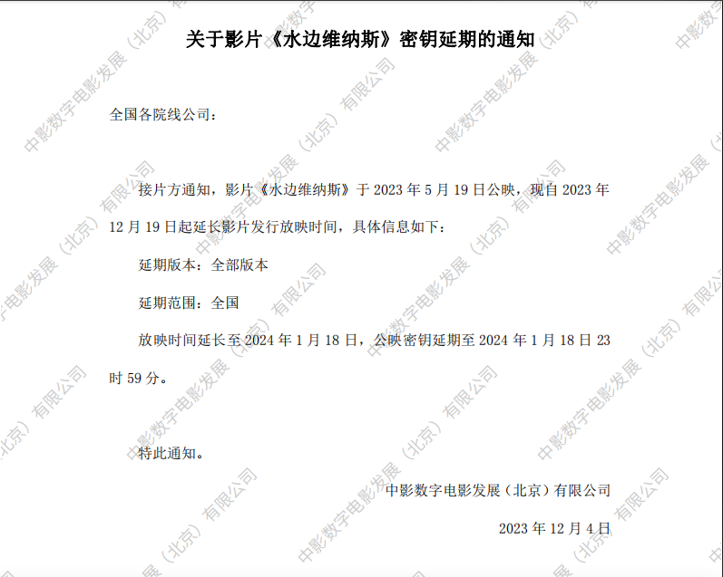 关于影片《水边维纳斯》第九次密钥延期的通知