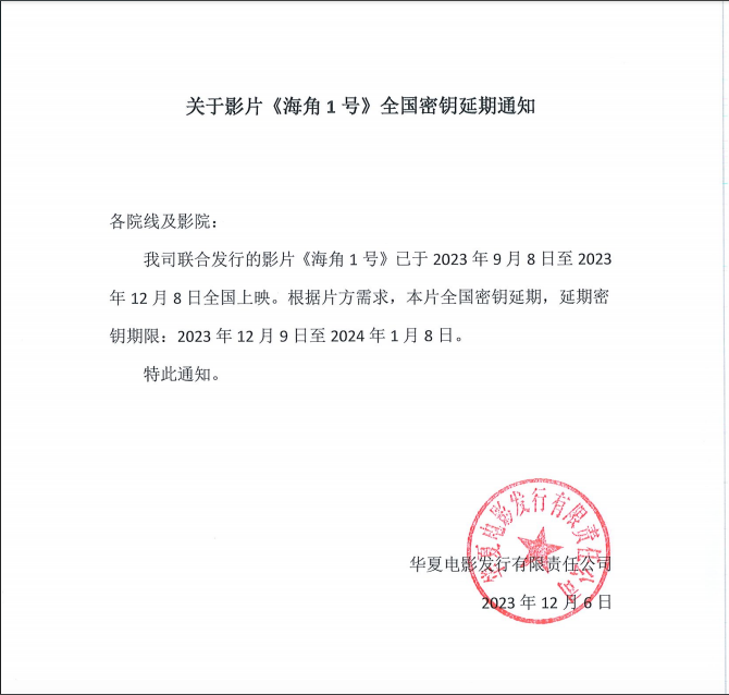 《海角1号》全国密钥延期的通知