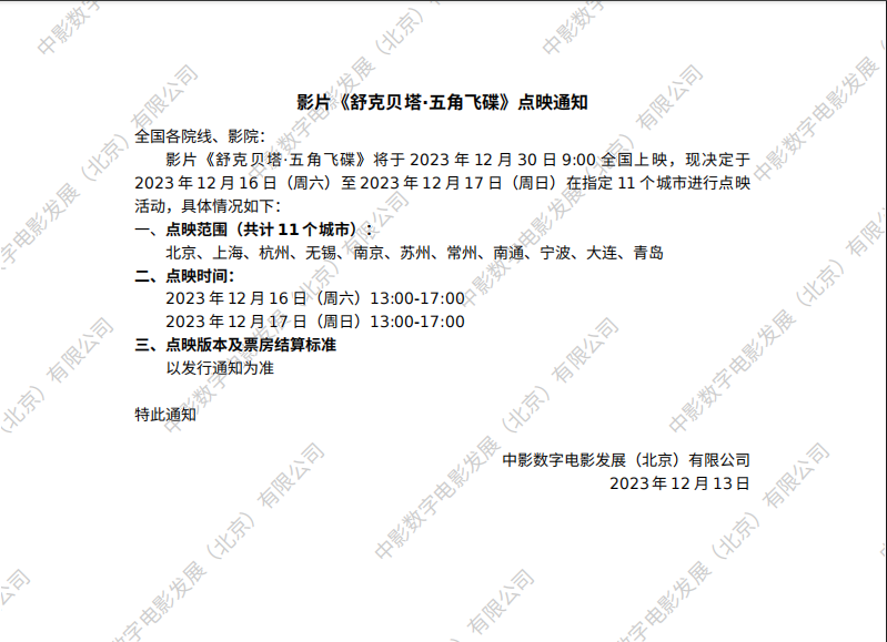 《舒克贝塔·五角飞碟》第二轮点映的通知