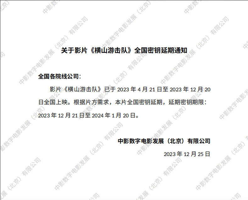 关于影片《横山游击队》全国密钥延期通知