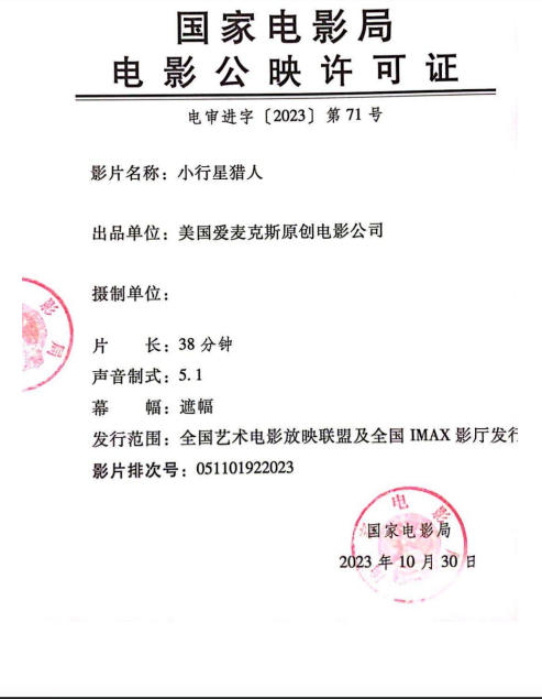 排 次 号:051101922023(2D);051401922023 (IMAX3D)
