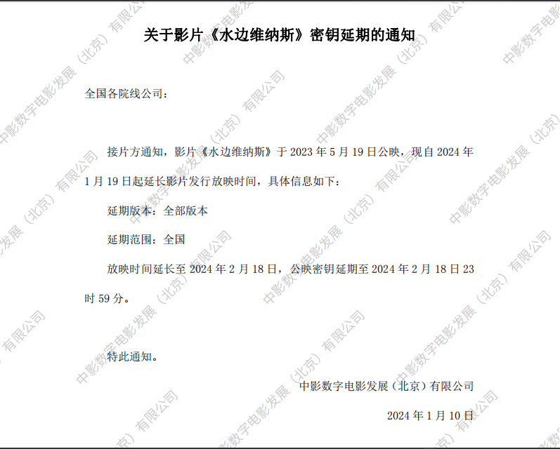 关于影片《水边维纳斯》第九次密钥延期的通知