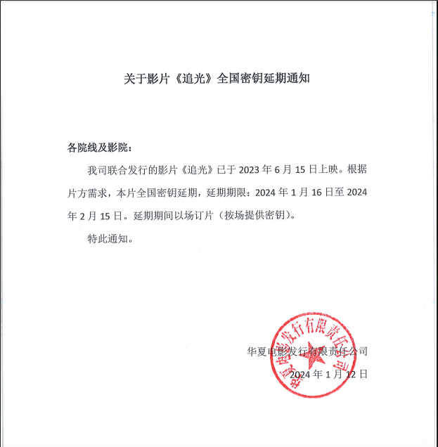 关于影片《追光》全国密钥延期通知