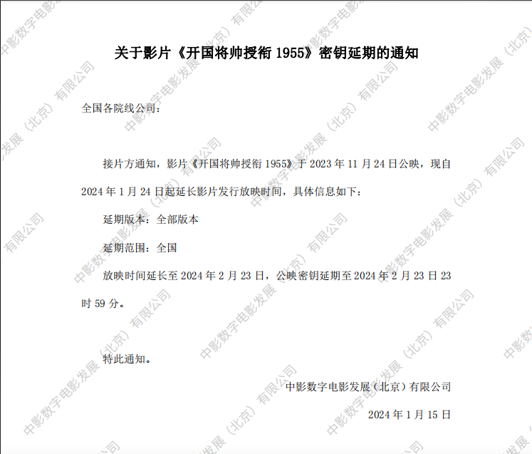 《开国将帅授衔1955》第十二次密钥延期的通知