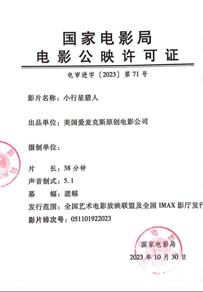 排 次 号:051101922023(2D);051401922023 (IMAX3D)