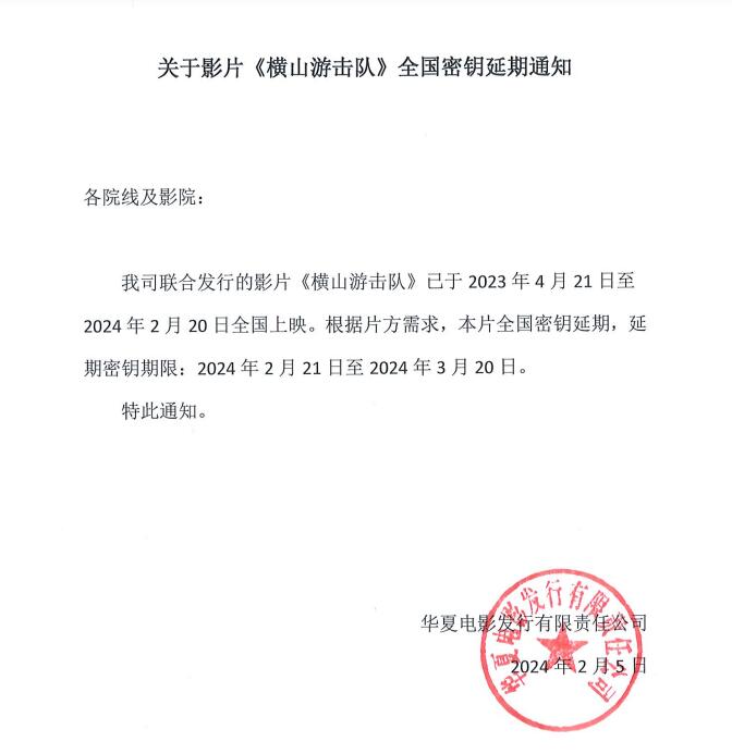 《横山游击队》全国密钥的延期通知