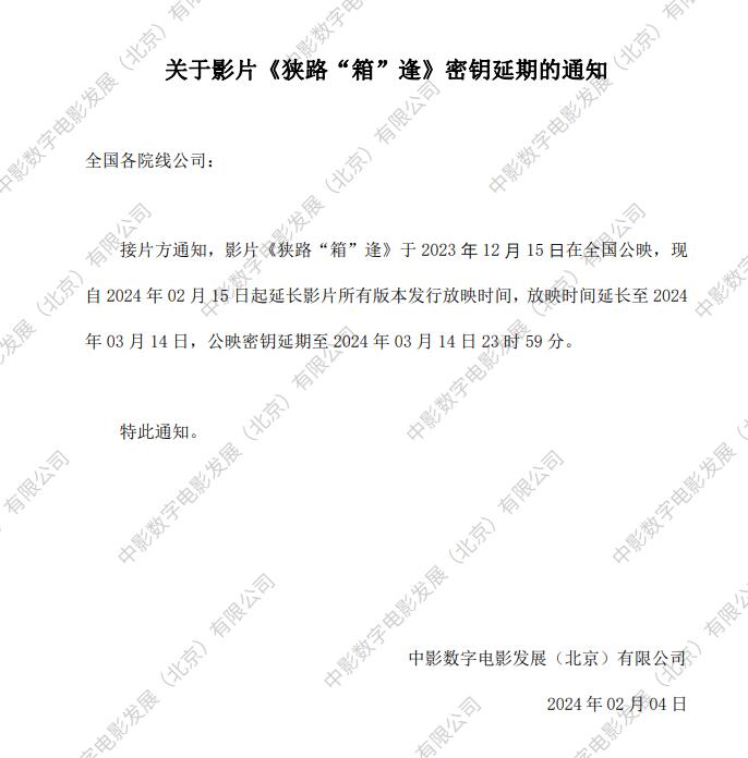 关于影片《狭路“箱”逢》8次密钥延期的通知