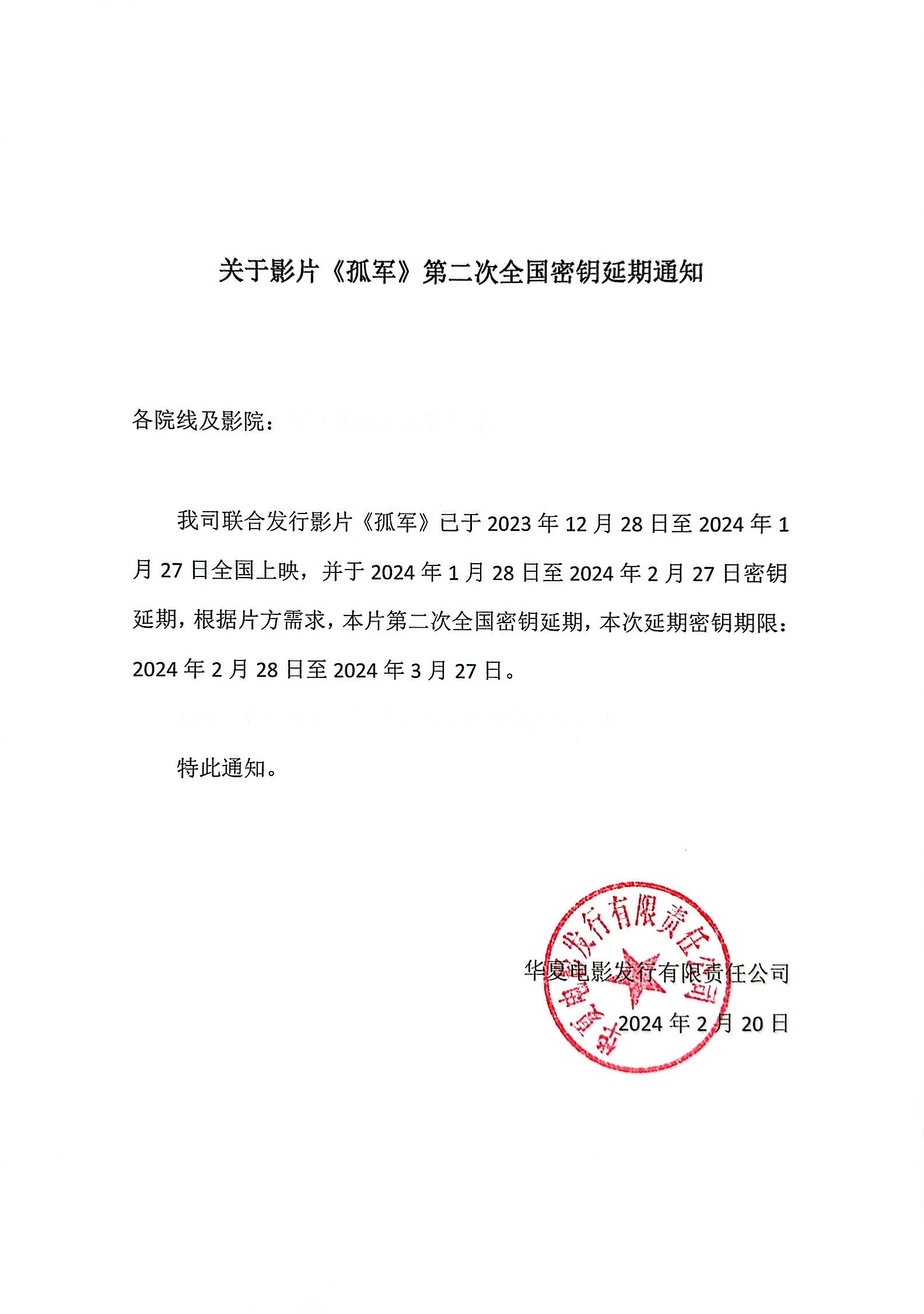 《孤军》第十二次全国密钥延期的通知