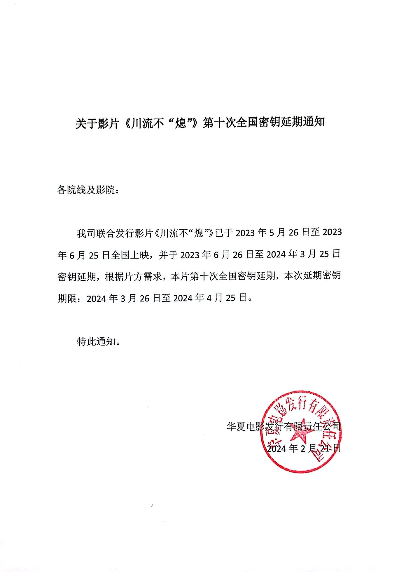 关于影片《川流不“熄”》第十一次全国密钥延期通知
