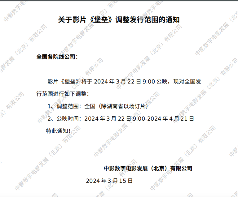《堡垒》第八次以场订片的通知